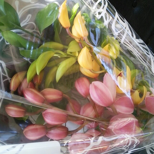 天然のお色なのに、とってもカラフルなシンビジュームの花束は