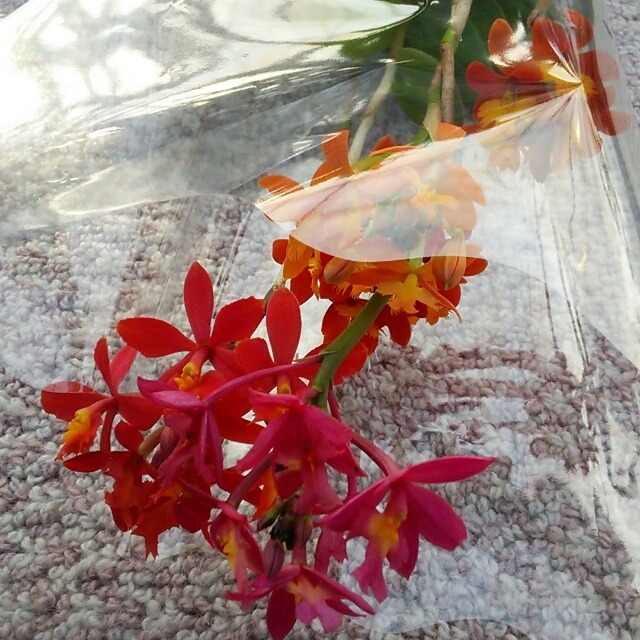 エピデンドラムMIXの花束は、濃色オレンジが情熱的な