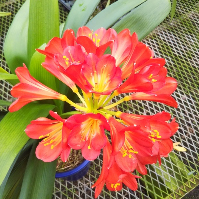 オレンジ色の花が咲く斑入りの君子蘭で、