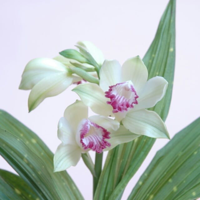 一般的な星ケイランは黄色花ですが、日向流星は変異種で白花紅舌です。